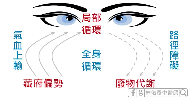 誠如《黃帝內經.靈樞.大惑論》:「五藏六府之精氣,皆上注於目而為之精。」《黃帝內經.靈樞.邪氣藏府病形篇》:「十二經脈,三百六十五絡,其血氣皆上於面而走空竅,其精陽氣上走於目而為睛。」