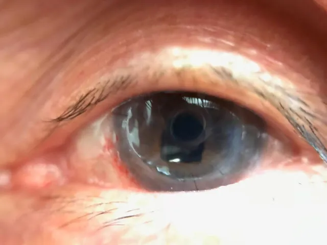 另外一位是雙眼全葡萄膜炎(從虹膜、睫狀肌、脈絡膜都反覆發炎),所有的檢查都找不出原因,風濕免疫科檢查也都無異常。眼科無法檢查眼底,虹膜與水晶體完全黏住,呈現在課本上看到的『瞳神乾缺』的現象(如附圖,),在散瞳之後,瞳孔呈不規則型。這一個情形要考慮的點非常多,大致上是從肝火論治,但因遷延日久,需要肝腎同治。加上患者身體狀況又非常的差,難度很高。針藥並用,著重疏肝滋陰。