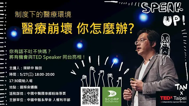 前些日子,TED x Taipei講者,也是口外騎士 – 陳畊仲醫師到了中國醫藥大學演講,邀請了醫界人士以及醫學生聊聊「醫療崩壞,你怎麼辦?」