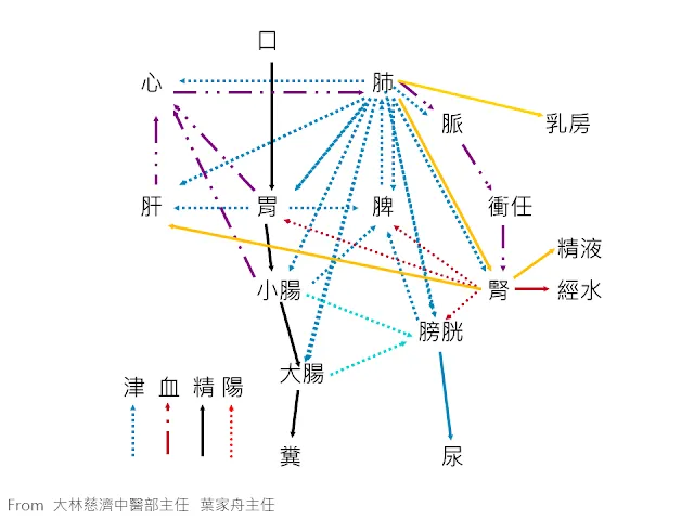 在這一連串的生理反應中,除了原文提到的臟腑外,仍須其他臟腑的協助才能完成。如:每段輸送過程需仰賴三焦(決瀆之官,水道出焉)道路的通暢、心氣推動血助肺朝百脈和腎陽助膀胱氣化水…等的幫助,才能完成。