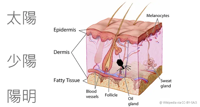 此外,中醫的陰陽五行常被視為無稽之談,實際上陰陽五行只是中醫的「代號和基礎」,類似換個角度看待人和疾病,故其實可以搭配現代生理來學習。如:把皮膚外層看作是太陽,皮膚到血管是少陽(半表半裏),更裏層是陽明。