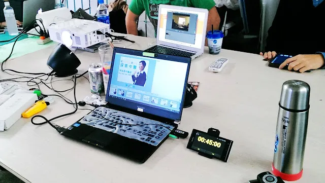 除了原本就有的筆電、簡報筆、微距投影機、麥克風之外,也增加了拉桿後背包、舊手機充當的計時器,以及演講時的道具。