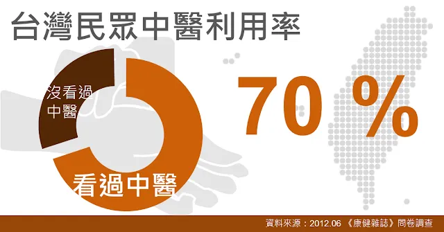 根據2012年康健雜誌的問卷調查,台灣大約每 10 位民眾中就有 7 個人看過中醫,而且接近七成的西醫不排斥民眾看中醫吃中藥。另外也有幾篇研究,台灣人使用中醫的比例相當高[註1、2、3、4 ],甚至在歐美的統計資料,也有 20 ~ 60 % 的民眾選擇整合及替代醫療,在歐美國家更蔚為風行。