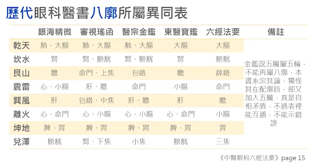甚至在《中醫眼科六經法要》的〈太陽目病舉要篇〉也說到「有時從輪廓,有時認六經,時而會萃來看,時而分別來看,時而又從全身病傳來看,在臨症時才來決定取。一切眼病,都應作如是觀。」這有說就等於沒說一樣,要怎麼用仍然沒有一個準則。