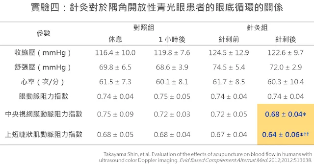 從上表的數據可以發現,針灸之後對於眼底動脈阻力有顯著的降低,無論是與一個月前的對照組數據及當天針灸前後的數據都有統計學上的差異。而機制與前面實驗二推論的一樣。所以作者認為,隅角開放性青光眼的患者在接受常規治療時可搭配針灸治療提高眼部的治療效果。