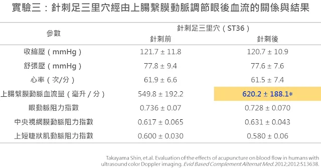 由上表可以發現,針刺足三里穴對於心率與血壓沒有明顯的變化,但上腸繫膜動脈的血流量卻有明顯的上升,於統計學上有顯著的差異,然而對於眼部的阻力指數沒有明顯的變化。所以可以證明針刺足三里穴對於腸胃道的血流(尤其是上腸繫膜動脈)會有顯著的影響。
