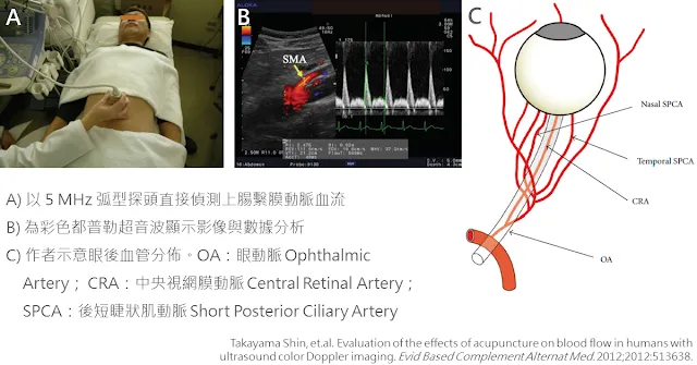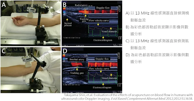 這篇研究是由日本仙台的東北大學(Tohoku University)進行的研究,由高山真(Takayama Shin)講師所進行的實驗,於 2012 年刊登於 Evidence-Based Complementary and Alternative Medicine ( eCAM ) 期刊(2012 Impact Factor = 1.722, 整合與替代醫學領域 Ranking 8/22)的回顧性文章「Evaluation of the Effects of Acupuncture on Blood Flow in Humans with Ultrasound Color Doppler Imaging」。