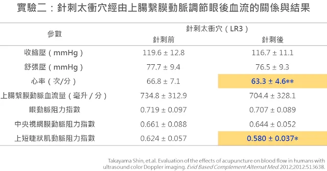從上表可以看見,心率在針刺後下降且有顯著差異,另外在上短睫狀肌動脈的阻力指數也有顯著的降低。作者指出,先前有兩篇研究認為眼部的血液循環與自主神經的調節、一氧化氮、降鈣素基因相關胜肽(calcitonin gene-related peptide)有關,也指出眼部內部的血液調控與軀體自主神經反射(somatoautonomic reflex mechanisms)的關聯。所以推論針刺太衝穴也許是可能因為以上的機制進而調控眼部的血液循環。