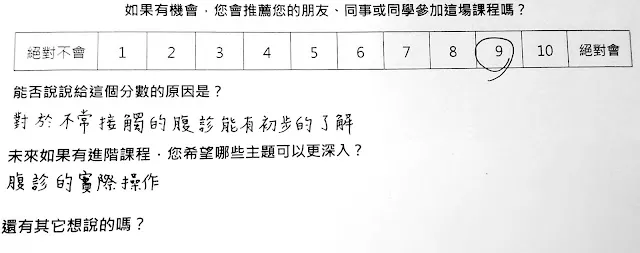 但是,這次在完全沒有試講的情況下(自首…忙到沒有試講>"<),整體滿意度還是有 4.33 分(滿分5分)。最低分的還是分組練習,如果學校能外借臨床技能教室,再加上找到助教與道具,就不會那麼低分了…
