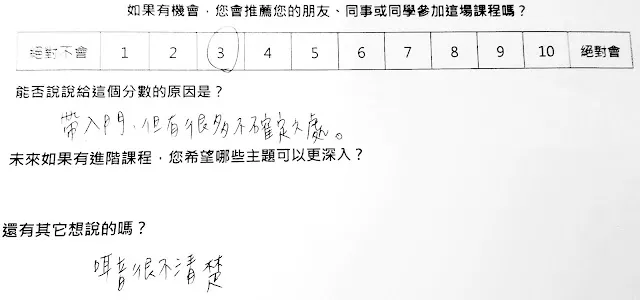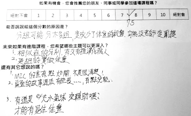 推薦指數 NPS = 42.3 分(用 growth hack 的算法,40 分剛好是可以開始收錢的 Minimal Viable Product)。如果再加上助教、道具,改善場地與設備,應該有機會提升到 60 分(70分已經是 Apple 產品的等級囉)只不過,要提升這些問題,還是得要花錢找地點,但這樣收費是否要用公會與學會的標準呢? 這次真的學到很多經驗,但一直用這個標準玩真的是會搞死自己啊>"<