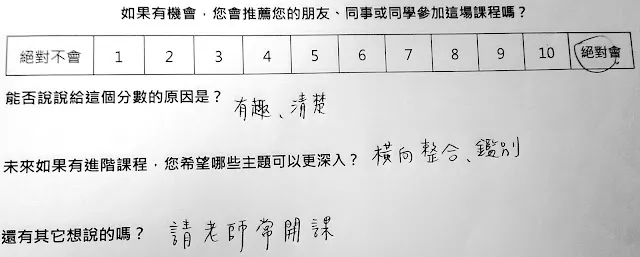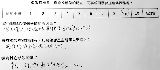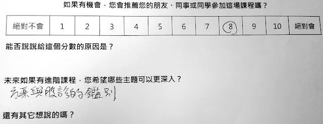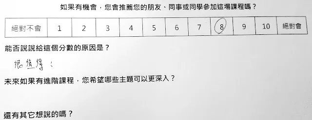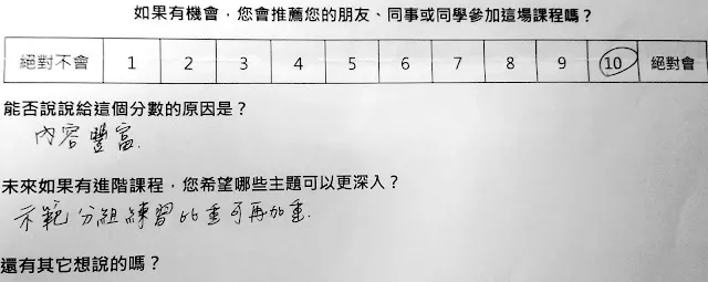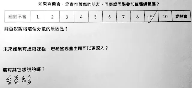 另外,上一場結束之後,我寫下了這段話『推薦指數 NPS = 42.3 分(用 growth hack 的算法,40 分剛好是可以開始收錢的 Minimal Viable Product)。如果再加上助教、道具,改善場地與設備,應該有機會提升到 60 分(70分已經是 Apple 產品的等級XDD)』