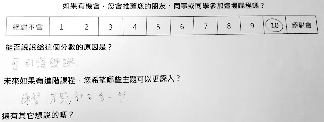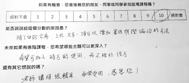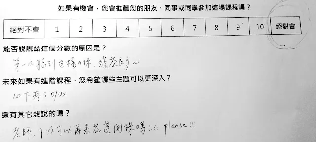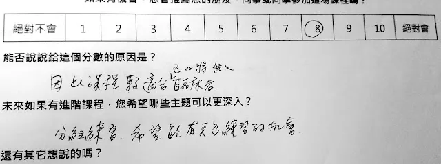 結果,這一次的推薦指數 NPS =75!!!!!這次只加上了道具,還沒有工作人員與助教耶!!!還有,麥克風與擴大器還是一個問題,但我覺得還是受限於教室裡的嗽叭設備。如果把台中場地的問題搞定,應該就可以定期開班了~