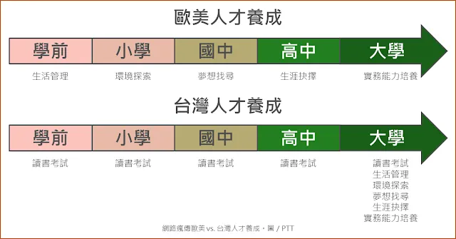 讀書只為了升學,升學只為了考上更好的學校,畢業後反而成為了生活白痴,這些例子不乏多聞。卻也從未想過,生活管理能力本來就該在學前就養成的,但也看過上了大學還要父母跑到住宿打掃房間、或是叫孩子起來上學的事件。更有需要家長幫忙決定畢業後找工作、接送去公司面試的狀況。還記得曾在臉書上看到有人分享過一張圖,國外的 教育目標是依照不同階段養成不同能力,但台灣卻是在大學之前只要求學業成績,到了大學才回頭怪以前為什麼沒有教過?以往接受過的教育方式,只有要求讀書考試,好好念書似乎成了教養的唯一目的。