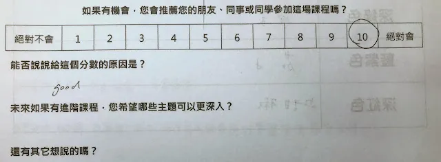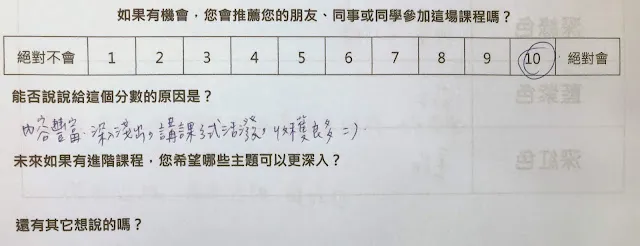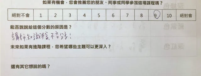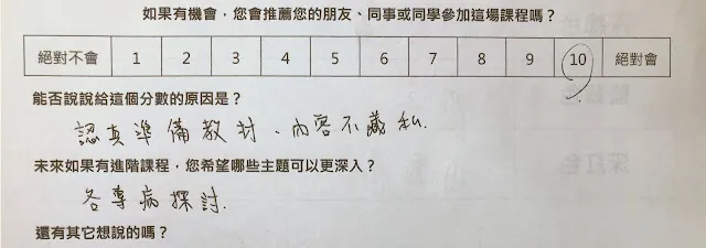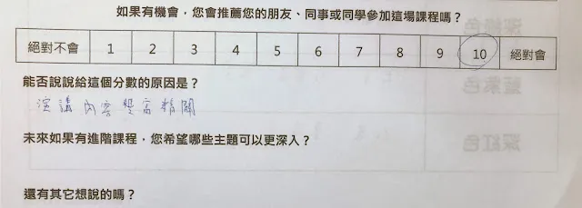 真的很開心!但也提醒自己不要被這種滿意度迷失了自我,依然保持教學的初心!附上手寫回饋表,也期待下次演講的改變與挑戰!