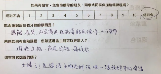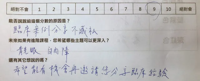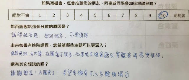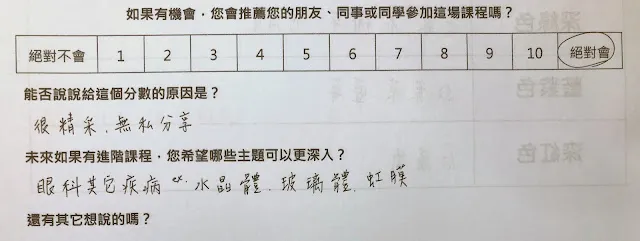 推薦指數 NPS 的部份(用 growth hack 的算法,40 分剛好是可以開始收錢的 Minimal Viable Product),先前中醫腹診花蓮場的 NPS 是 75 分,比蘋果手機的熱門推薦度高,義大後中的中醫眼科演講已經突破 90 分,而這一場卻是夢幻的 100 分!