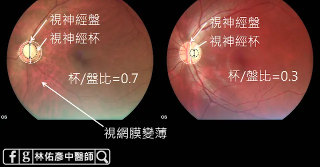 另外,更重要的是視神經,正常的視神經杯與視神經盤比例約為 0.3 左右,但芷芩的視神經杯盤比已經超過 0.7,視神經壓迫很明顯,如果沒有控制好,不只是視野缺損而已,甚至還會造成視神經不可修復的損傷。