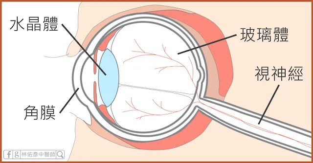 「另外,眼睛裡面的玻璃體主要是 99% 的水,約為 1% 的膠原支架與玻尿酸。當身體內的代謝產物增加,產生了過多的水濕或痰飲,多到從視網膜的微血管中滲透出來,或是讓玻璃體產生了液化,就有可能改變玻璃體原本均勻的狀態。就像是在水中溶解果糖的過程一樣,有些地方濃度比較高,與原本濃度比較淺的就產生折射,眼睛也可能看見灰黑色的點狀或絲狀的飛蚊了。」