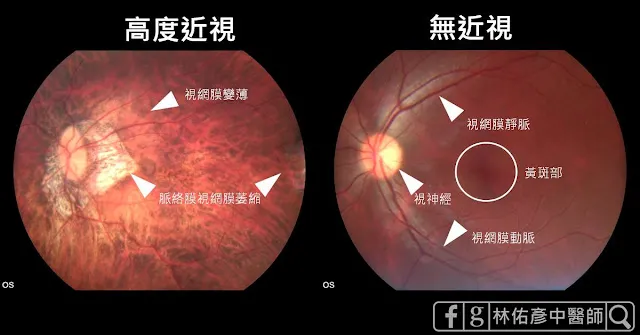 但是,這些治療方式都沒辦法改變眼球被拉長的事實。當高度近視之後,視網膜也會被撐大、變薄。就像皮膚一樣,如果變胖、或是懷孕之後,皮膚被撐開變薄,造成妊娠紋,視網膜也有類似的狀況出現,也可以在眼底看見視網膜變薄與退化的狀況。更嚴重可能會造成視網膜的拉扯或者撕裂、裂孔,或是視網膜剝離。