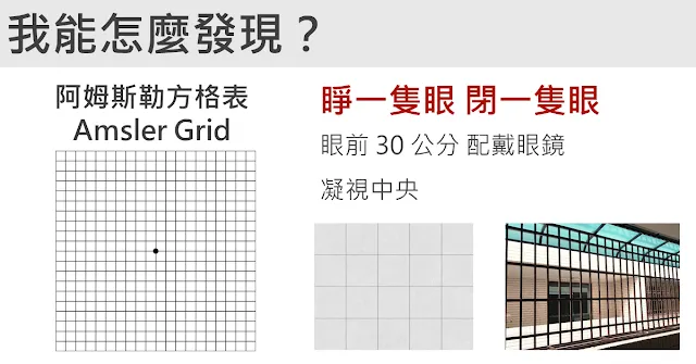 如果是高危險群的朋友們,平時可以睜一隻眼,閉一隻眼,檢查眼睛的狀況。可以利用方格紙,或是日常生活可以接觸到的磁磚、窗欄…等,檢查是否出現模糊、黑影、變色、扭曲的情況。如果出現變化就請儘快至眼科詳細檢查哦!